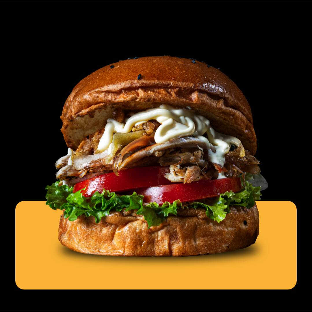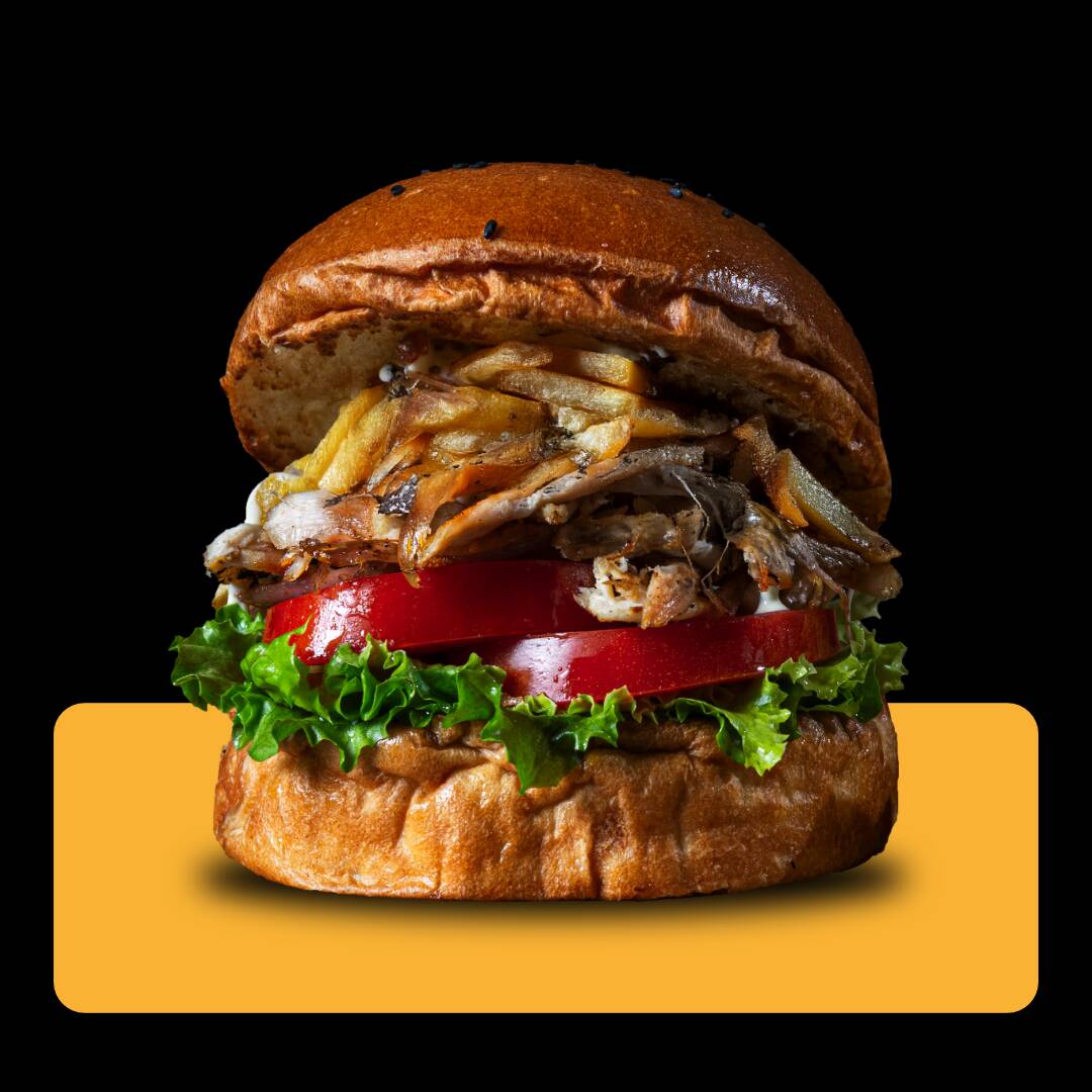 Sanguche de pollo a la brasa deshilachado en pan Brioche, lechuga, papas al hilo y acompañado de crocantes papas fritas nativas.