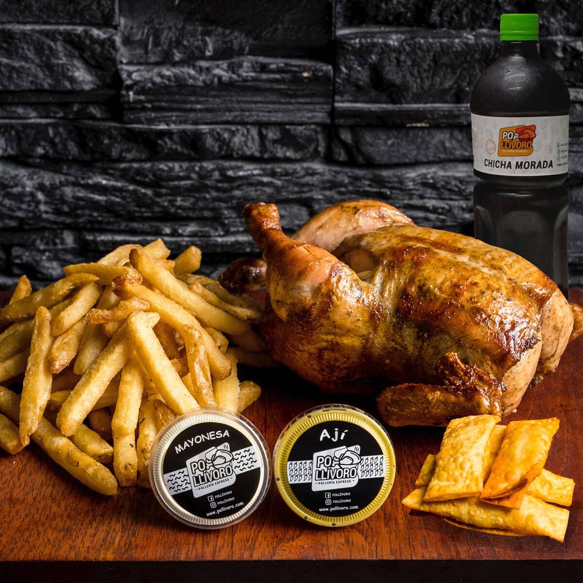 Pollo horneado en brasas, acompañado de crocantes de papas nativas fritas, cremas de la casa: ají Pollívoro (02) y mayonesa (01), 6 tequeños brasa Pollívoro con salsa golf (01) y chicha morada 1lt.