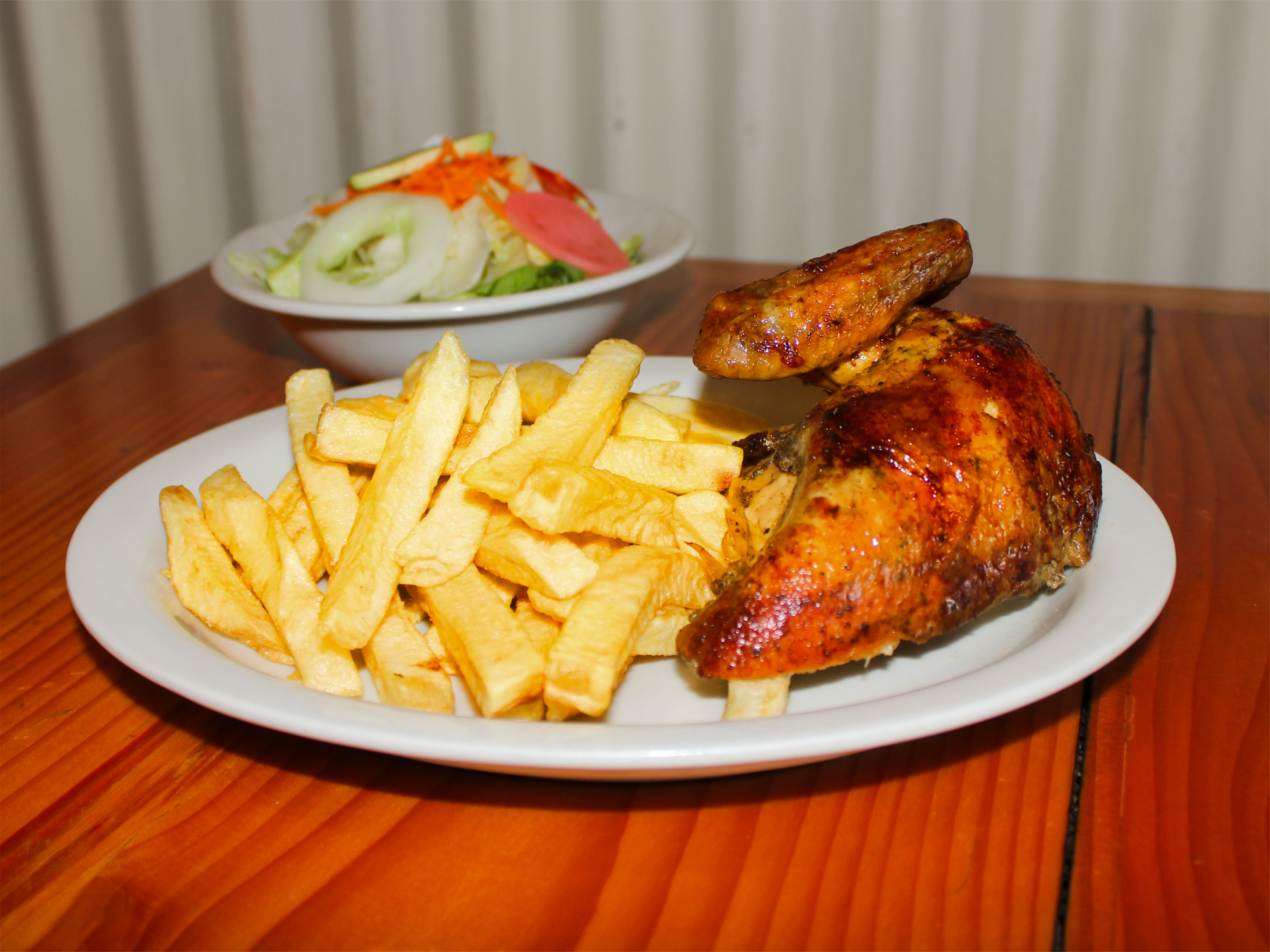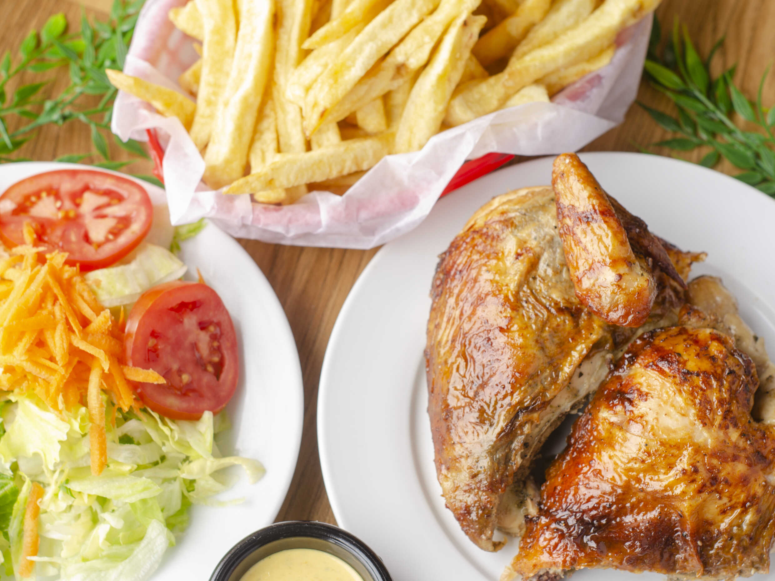 Jugoso medio pollo acompañado de papas fritas, ensalada casera y nuestras exquisitas salsas de la casa.