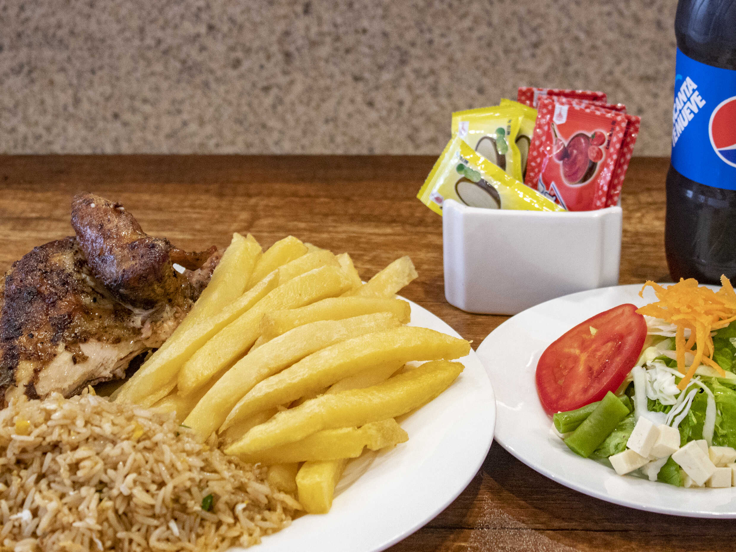 1/4 Pollo a la brasa con papas, arroz chaufa y Pepsi de 355 ml.