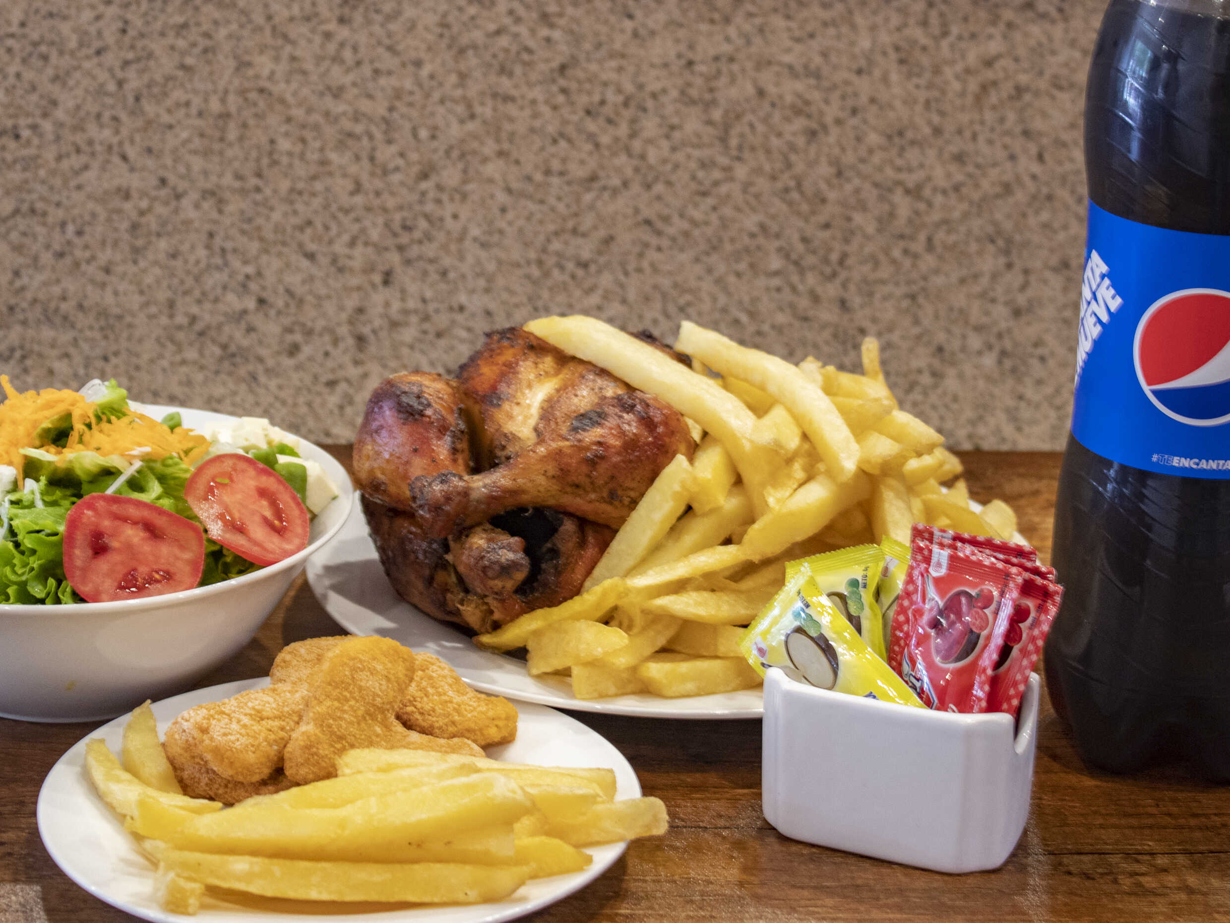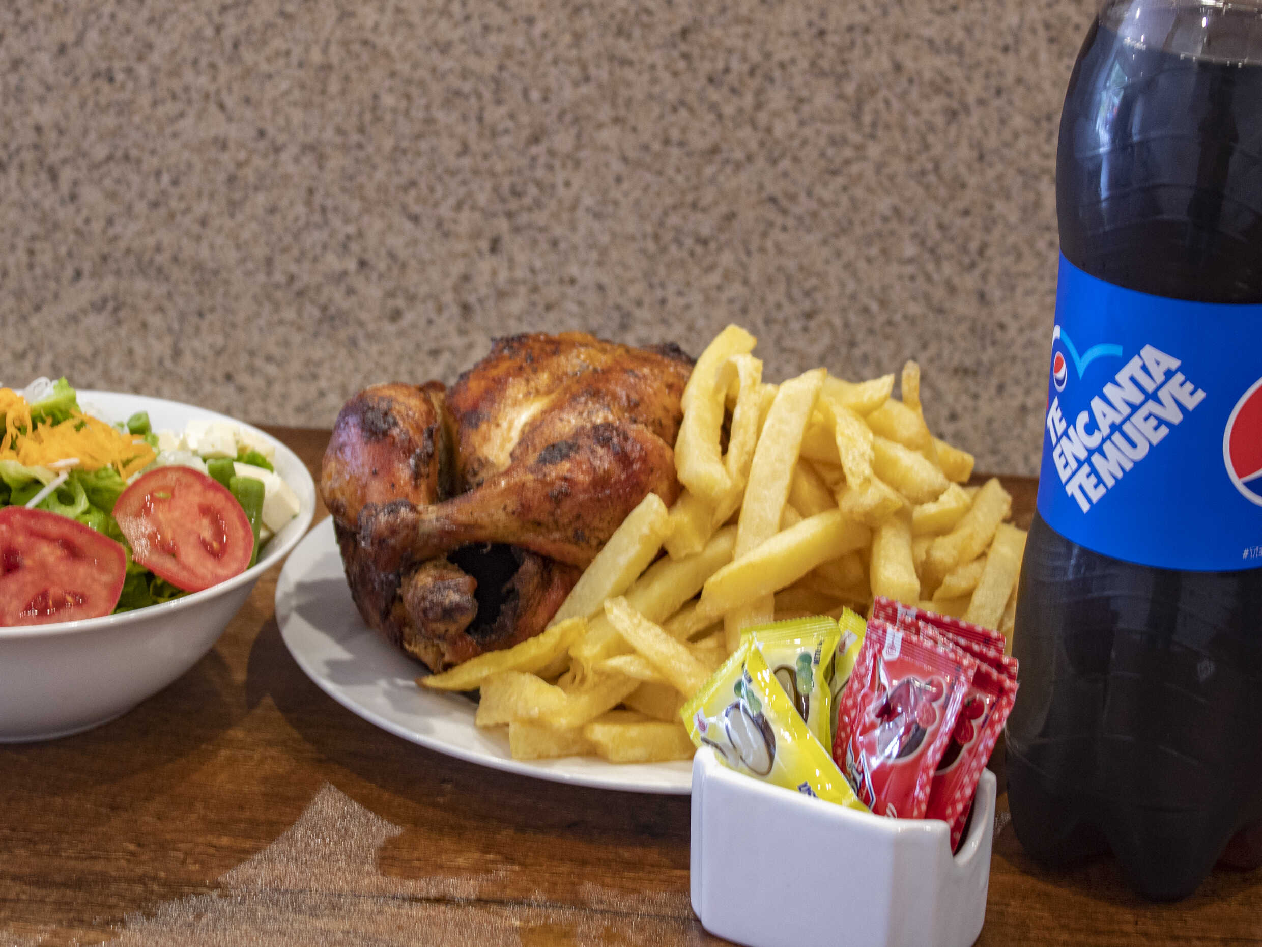 1 Pollo a la brasa con papas, ensalada, cremas y gaseosa Pepsi de 1.5 L.
