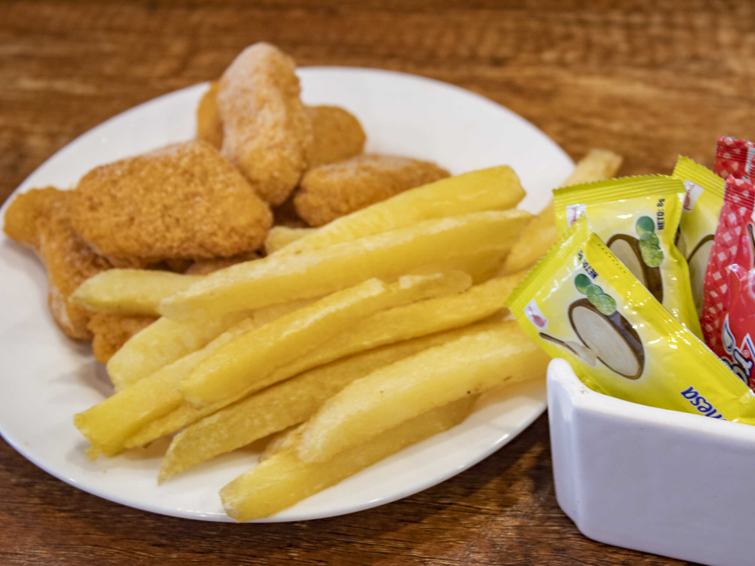 4 uds de nuggets de pollo acompañados con papas fritas