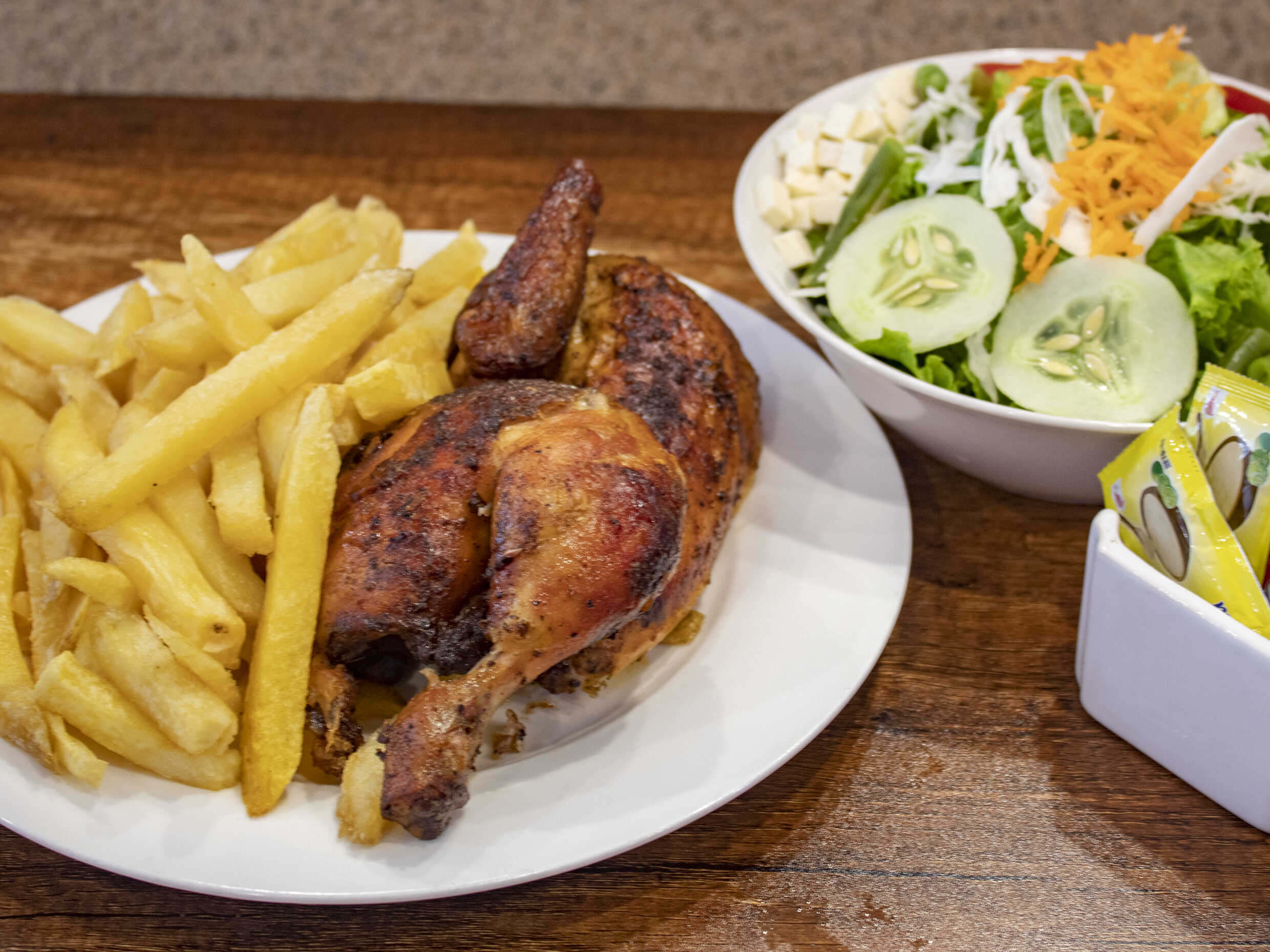 1 Pollo a la brasa con papas, ensalada, cremas y 1/4 de pollo sin papa.
