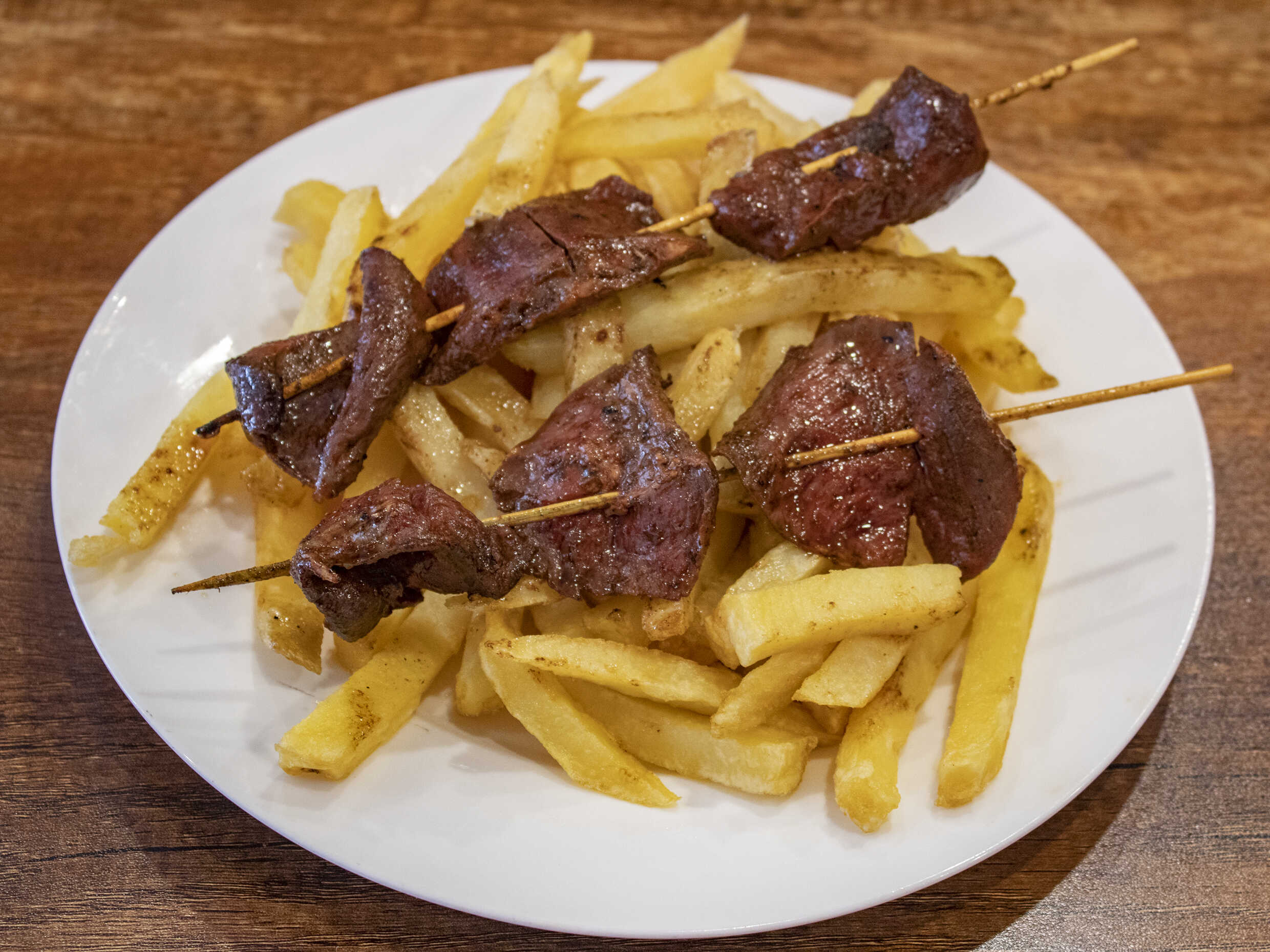 2 Palos de corazón de res a la parrilla acompañadas con papas.