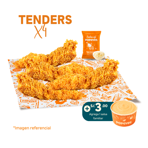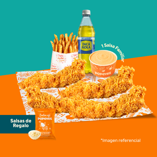 4 tenders de pechuga crispy + 1 papa cajún regular + 1 gaseosa 500 ml + 1 salsa familiar 3 oz