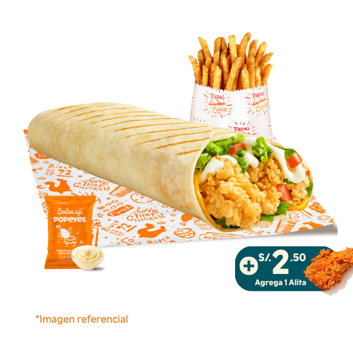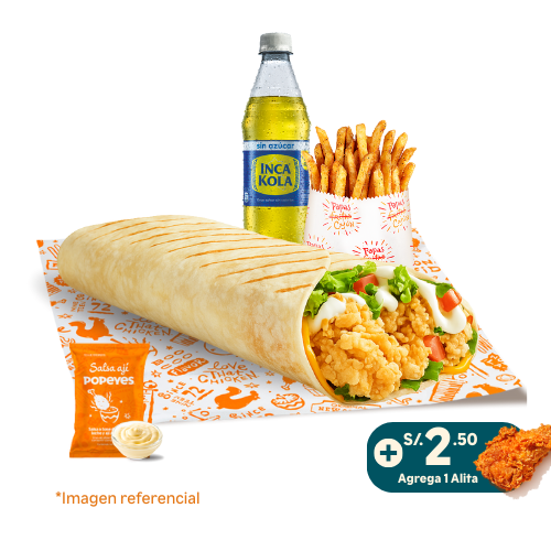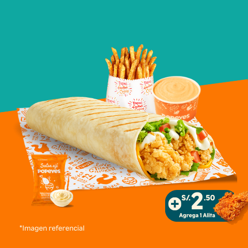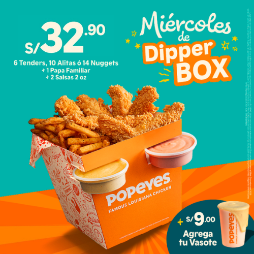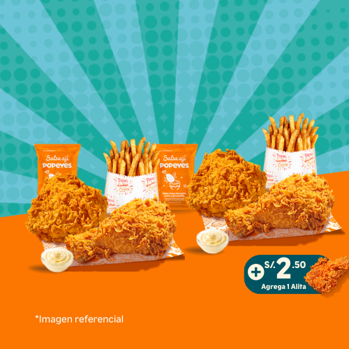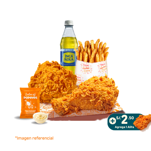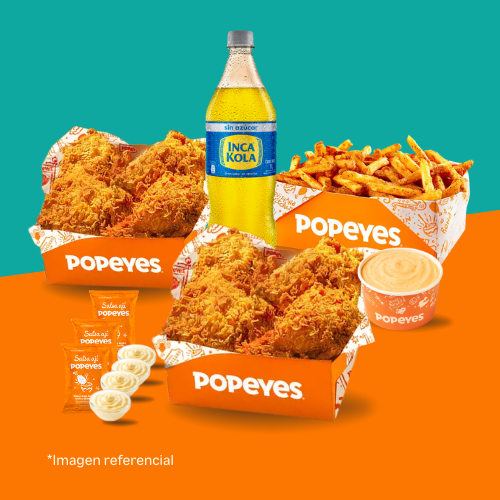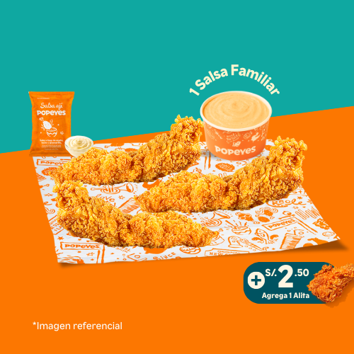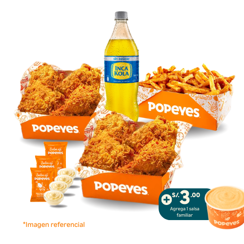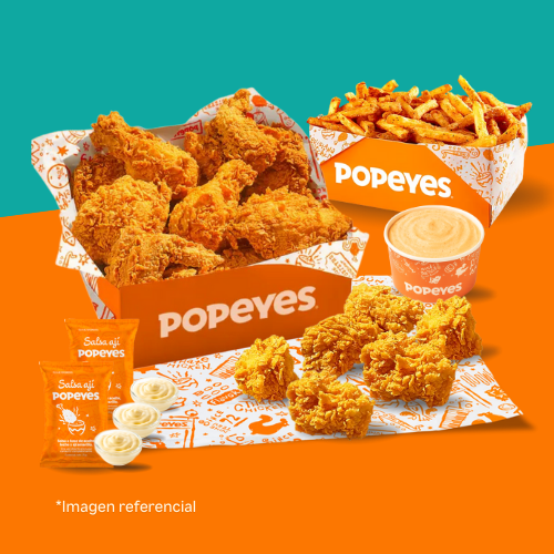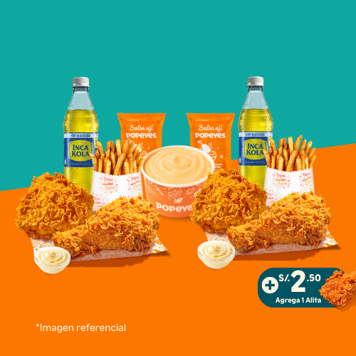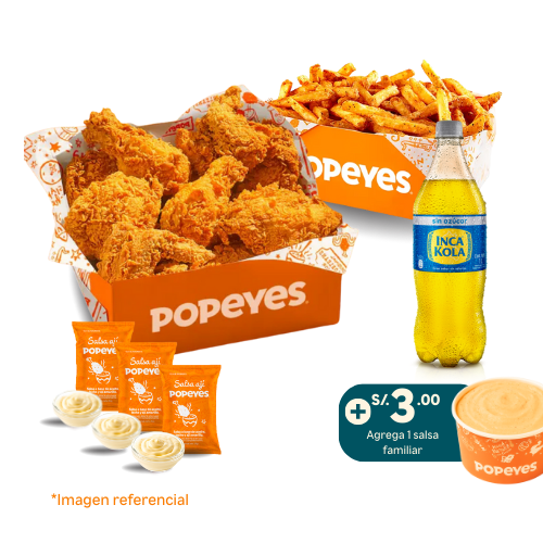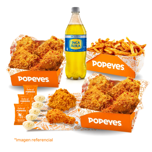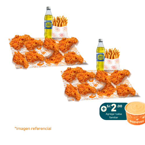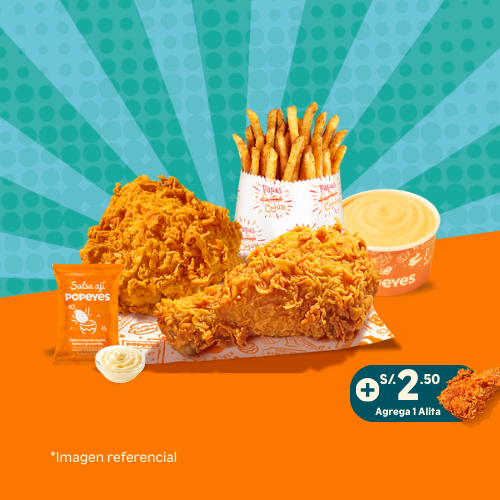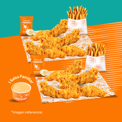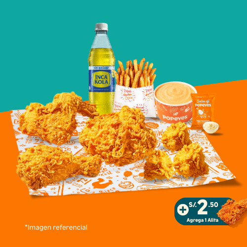6 tenders de pechuga crispy o 14 nuggets o 10 alitas + 1 papa cajún familiar + 2 salsas (2 oz). Añade +6 soles 2 gaseosas de 500 ml.
