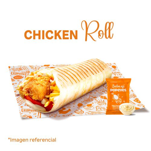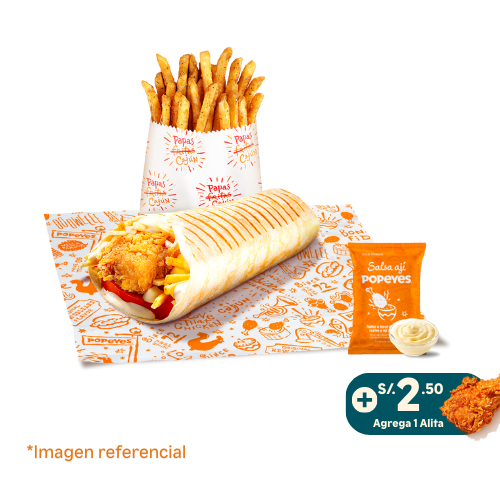 1 chicken roll (Tortilla pequeña con 1 tender, papas al hilo, tomate y mayonesa) + 1 papa cajun regular