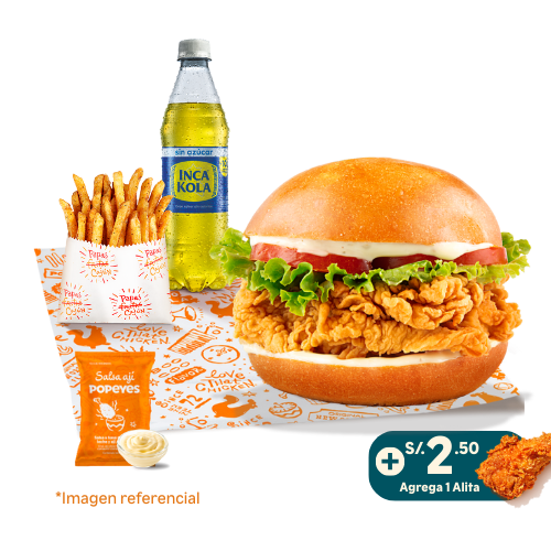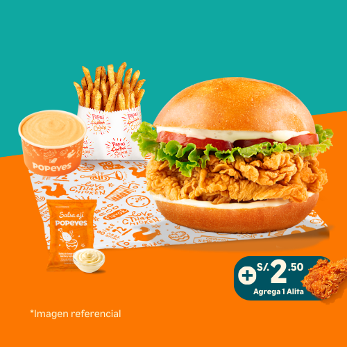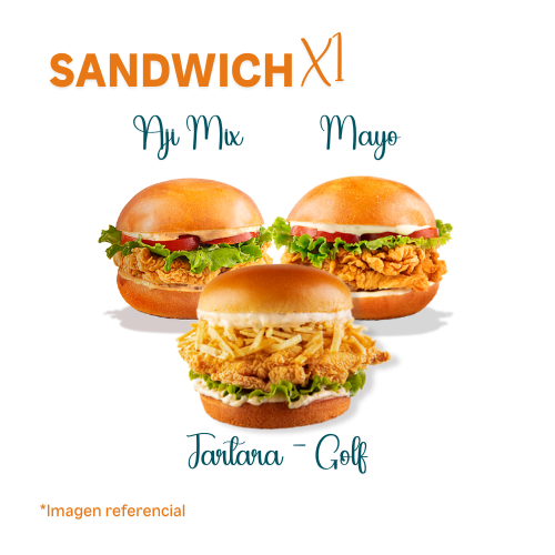Elige tu chicken sandwich favorito (disponible en tres versiones: Tártara Golf, Mayo Especial o Ají Mix) + 1 papa regular + 1 salsa familiar 3 oz