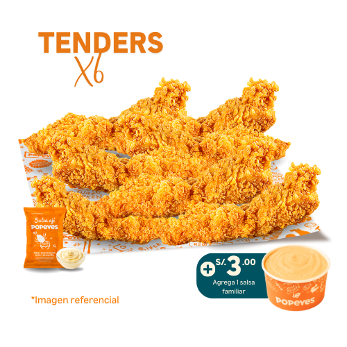 6 tenders de pechuga crispy + 2 papas cajun regular + 1 salsa familiar de 3 oz