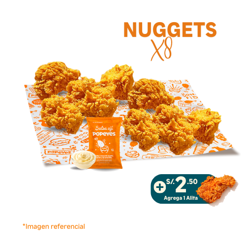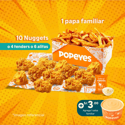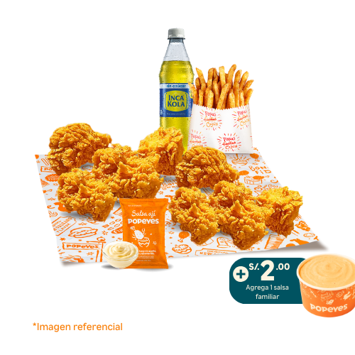 8 nuggets + 1 papa cajun regular +1 gaseosa 500ml. Agrega +2 soles una salsa familiar 3oz.