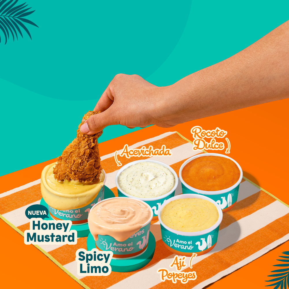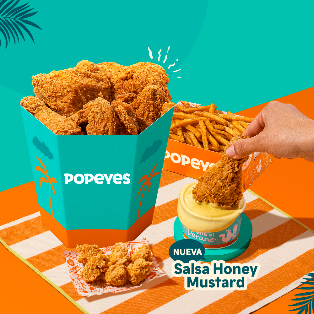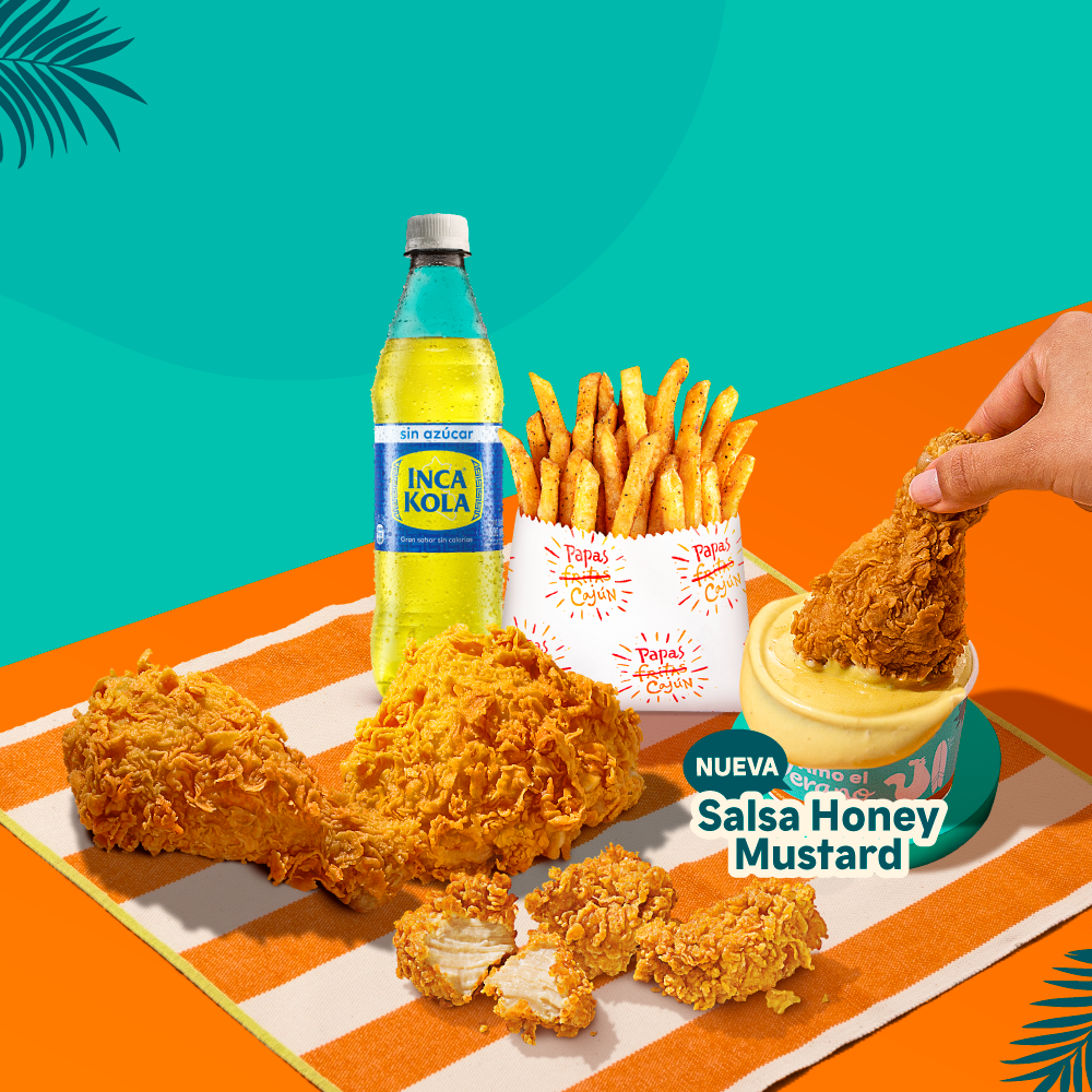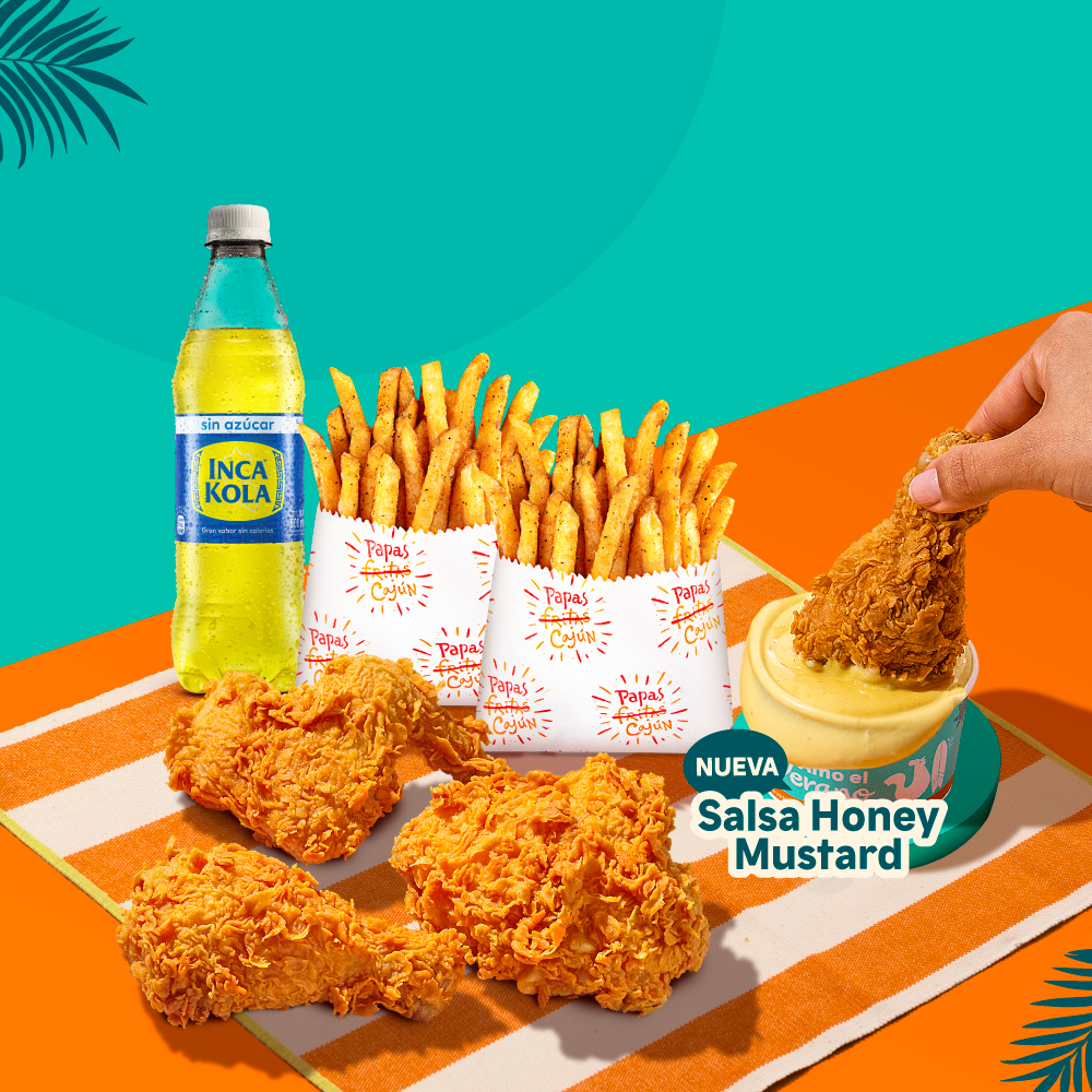4 piezas de pollo crujiente + 2 papas cajun regular + 2 gaseosas 500 ml + 1 salsa de 3 oz. Prueba nuestra nueva salsa Honey Mustard.