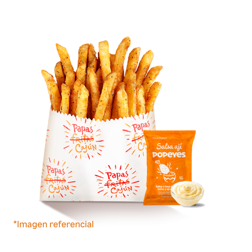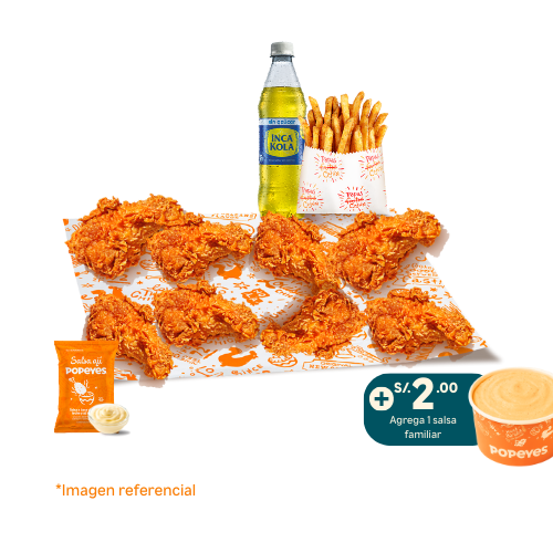 8 alitas picantes en receta cajun + 1 papa cajun regular +1 gaseosa 500ml. Agrega +2 soles una salsa familiar 3oz