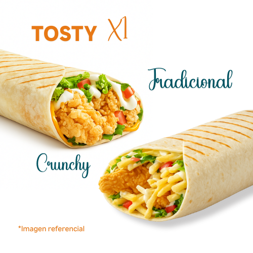 Elige tu Tosty favorito: Tosty Crunch (contiene 1 tender y 1 nugget crujiente, papas al hilo, queso cheddar, salsa de tocino ahumado, tomate y lechuga); o el Tosty tradicional (contiene 1 tender y 1 nugget crujiente, queso cheddar, mayonesa, tomate y l