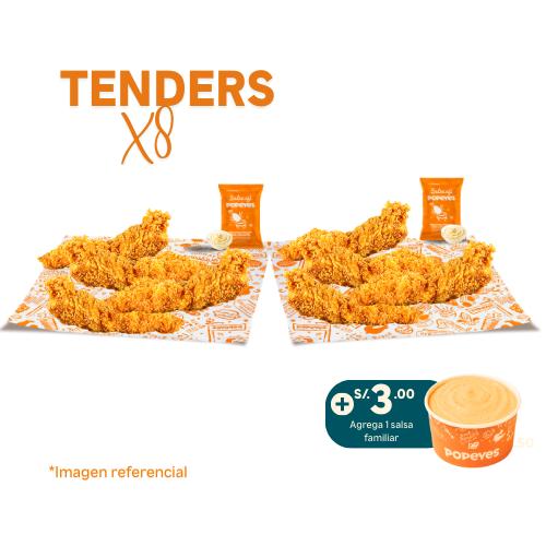 8 tenders de pechuga crispy + 2 papas cajun regular + 1 salsa familiar de 3 oz