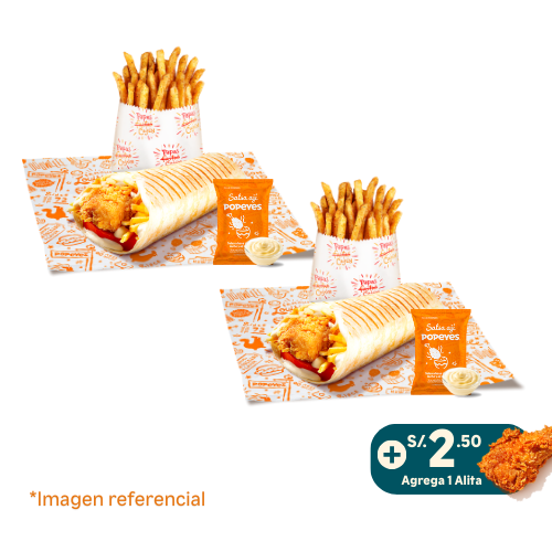 2 chicken roll (Tortilla pequeña con 1 tender, papas al hilo, tomate y mayonesa) + 2 papa cajun regular