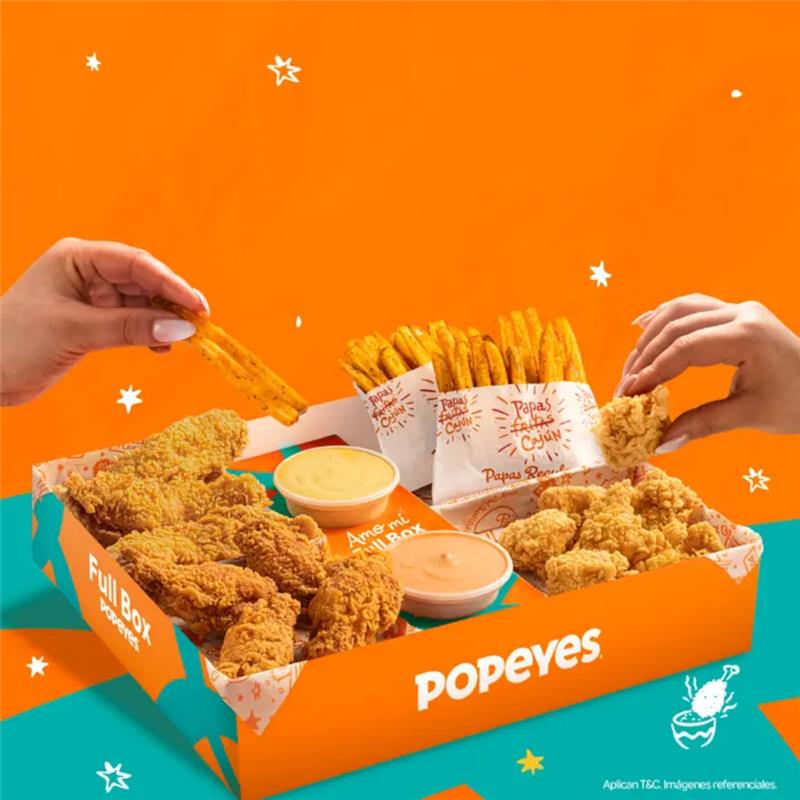 6 tenders de pechuga crispy o 14 nuggets o 10 alitas + 1 papa cajún familiar + 2 salsas (2 oz). Añade +6 soles 2 gaseosas de 500 ml.