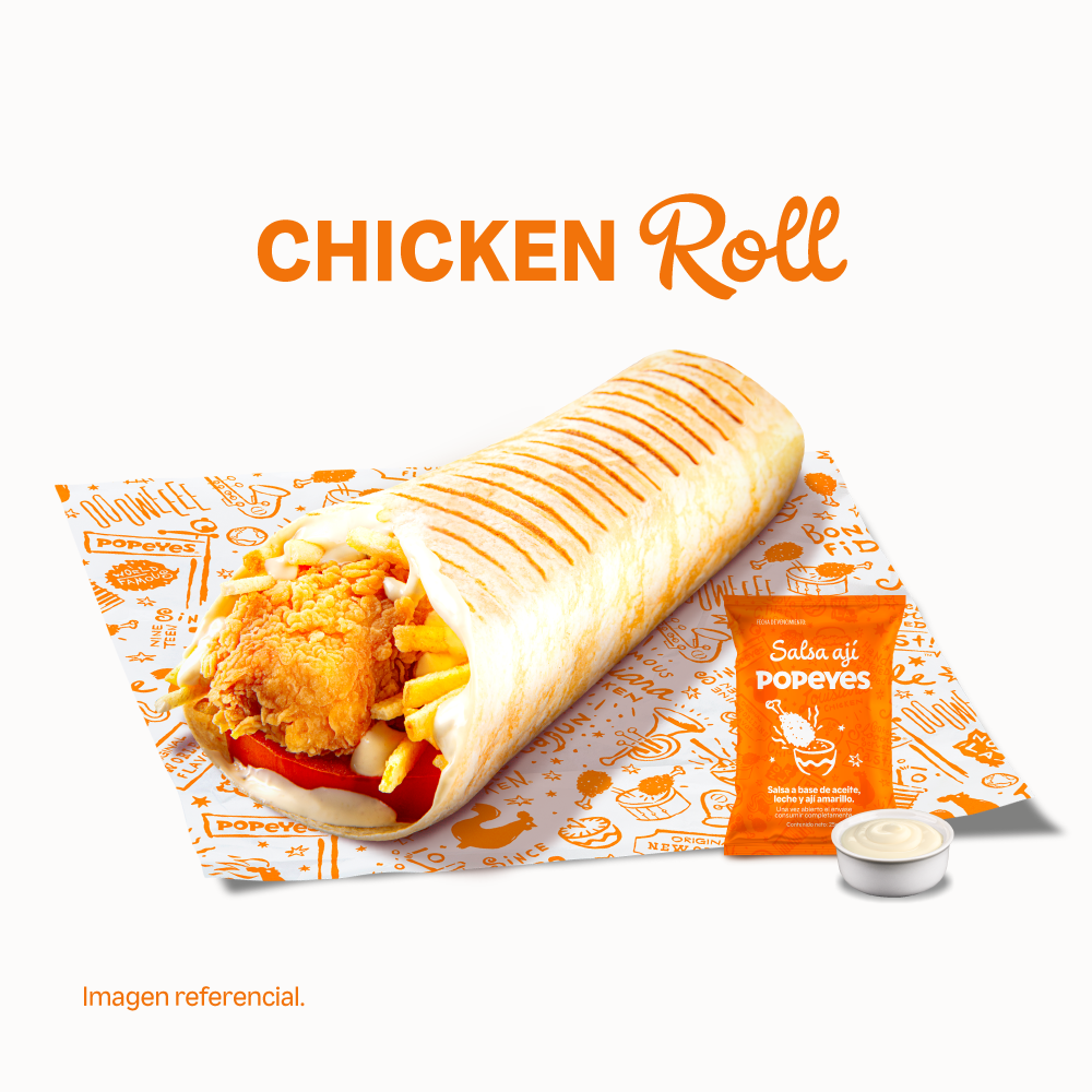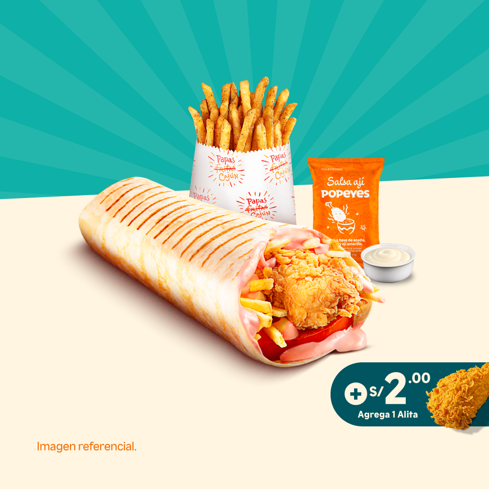 Chicken Roll(Tortilla, pollo crujiente, papas al hilo, tomate y mayonesa) y 1 Papa Cajún Regular