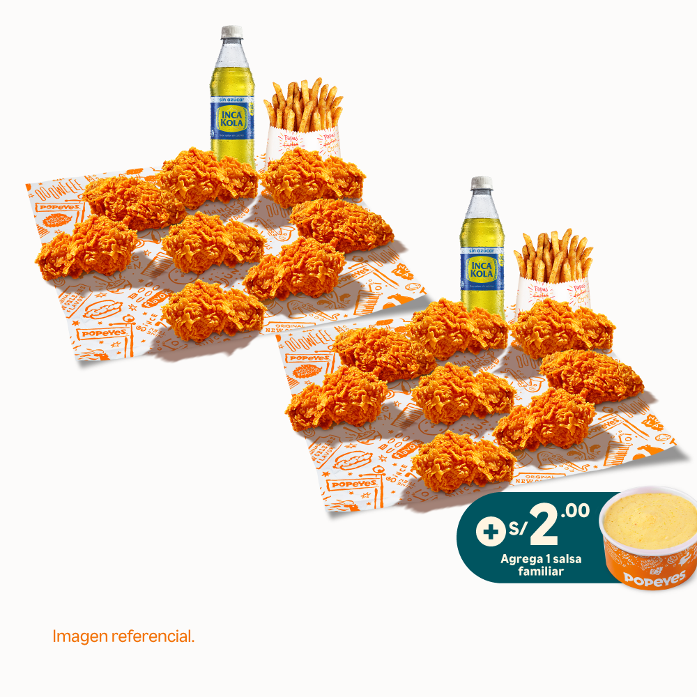 16 nuggets + 2 papa cajun regular + 2 gaseosa 500ml. Agrega +2 soles una salsa familiar 3oz.