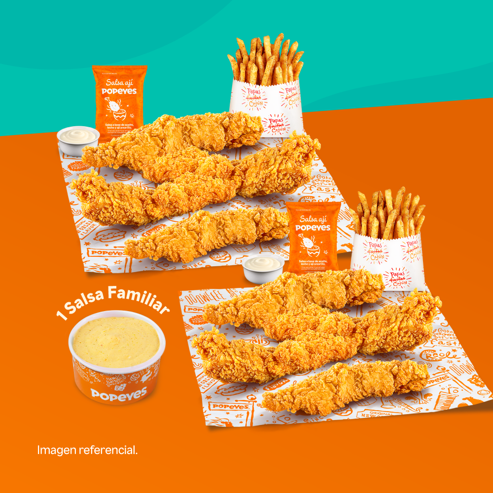 8 tenders de pechuga crispy + 2 papas cajun regular + 1 salsa familiar de 3 oz