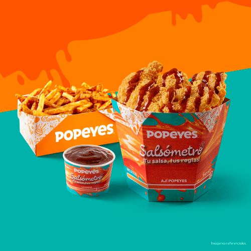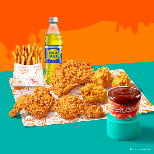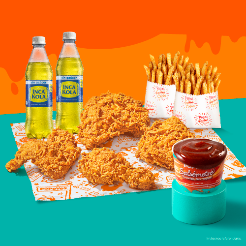 6 tenders de pechuga crispy o 14 nuggets o 10 alitas + 1 papa cajún familiar + 2 salsas (2 oz). Añade +6 soles 2 gaseosas de 500 ml.