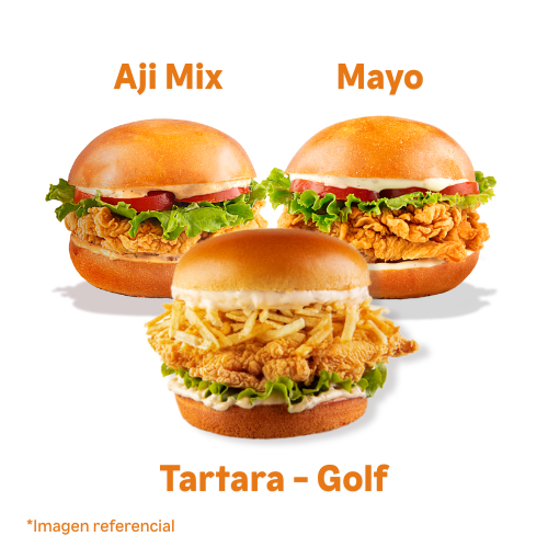 Disfruta nuestro Súper Sándwich de pechuga de pollo crujiente en pan brioche, disponible en tres versiones: Tártara Golf con papas al hilo, lechuga y salsa tártara golf; Mayo Especial con tomate, lechuga y mayonesa especial; y Ají Mix con tomate, lechuga