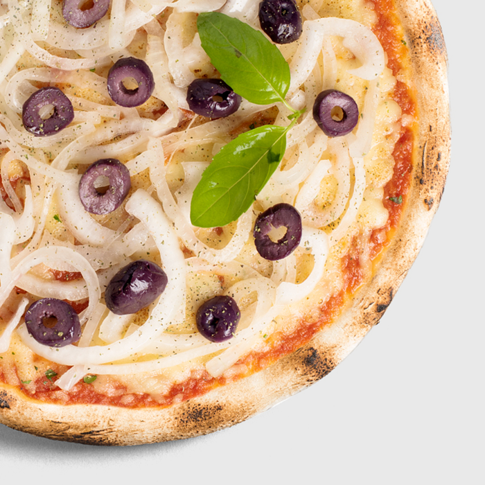 Salsa de tomate artesanal, queso mozzarella, chorizo gourmet, cebolla, aceitunas.