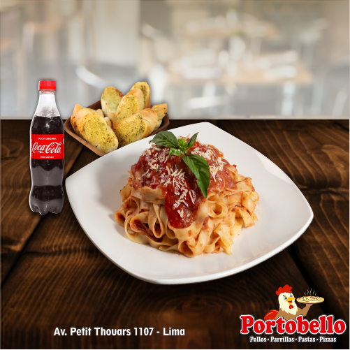 Fetuccinis de huevo con salsa a elección, 6 panes al ajo y gaseosas 450 ml.