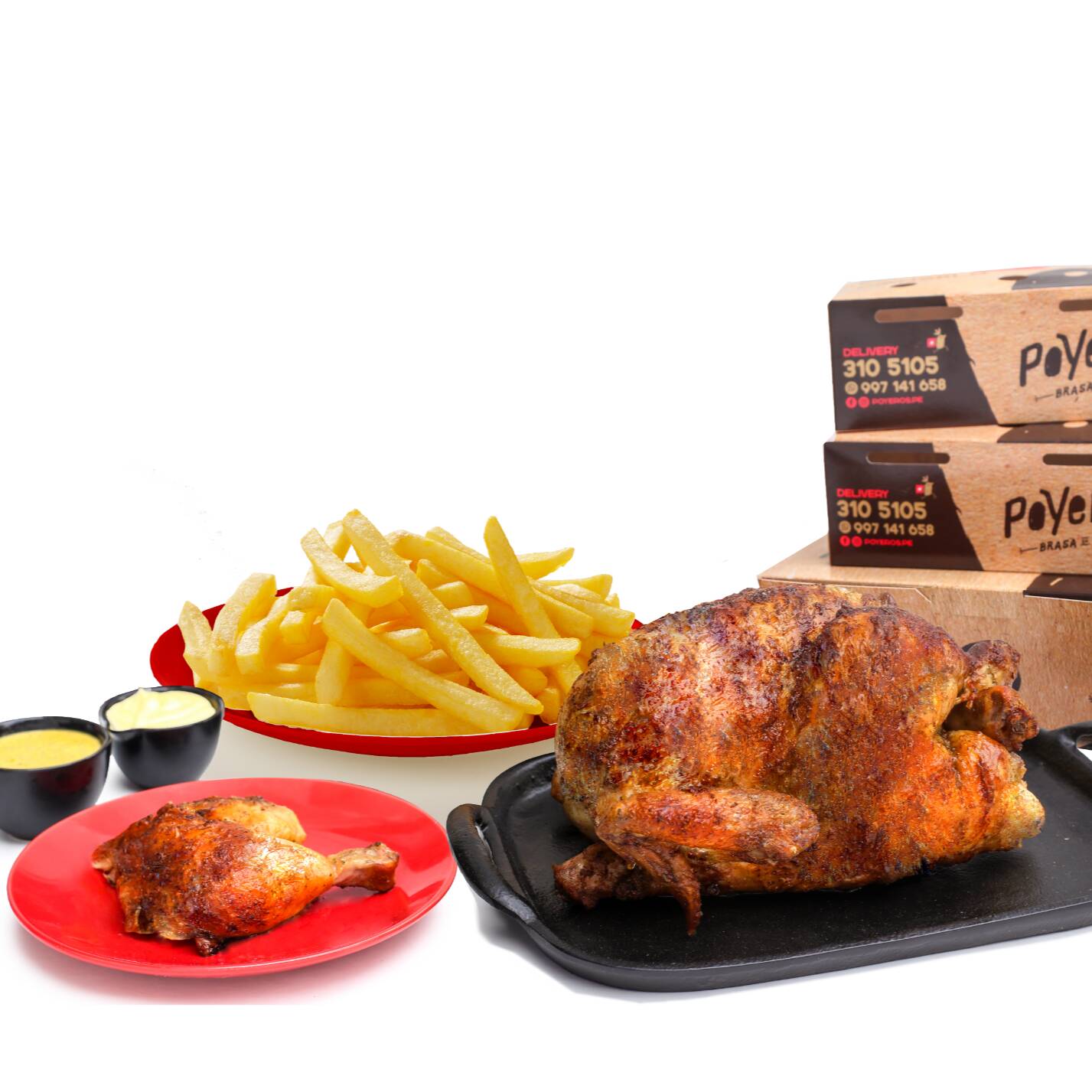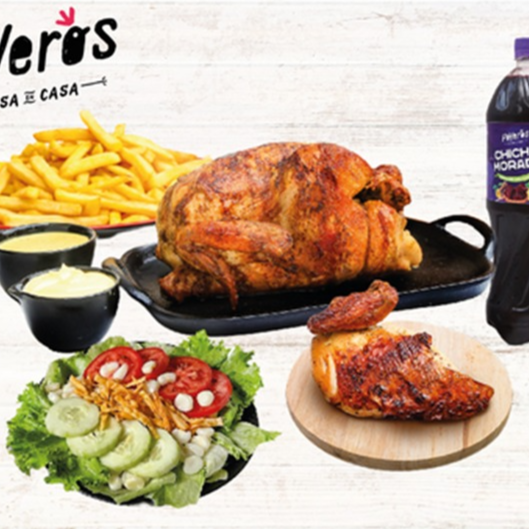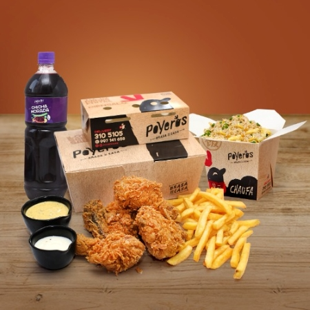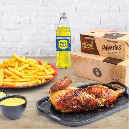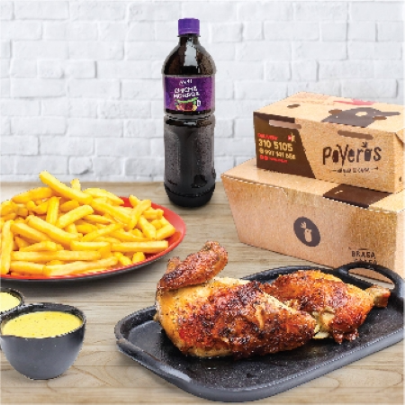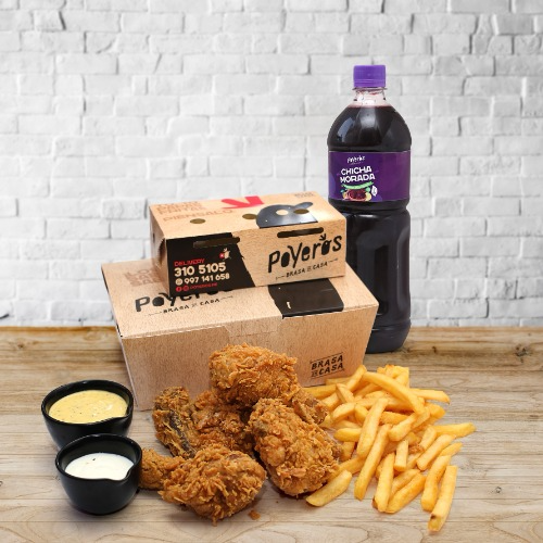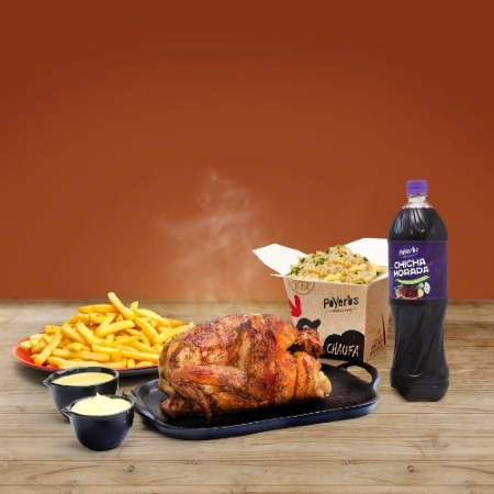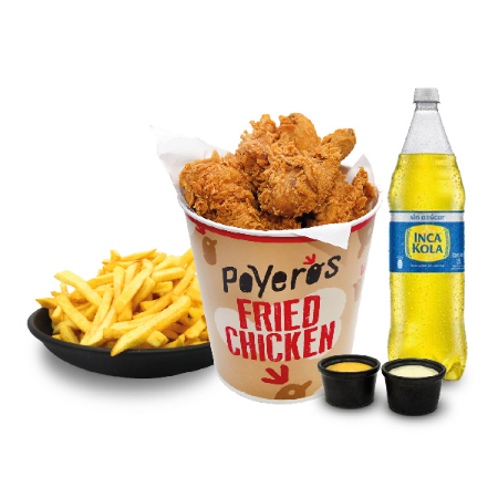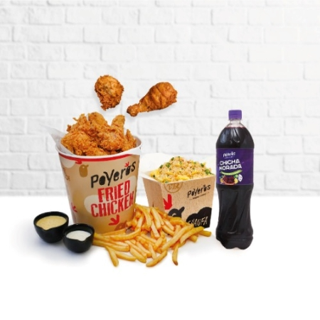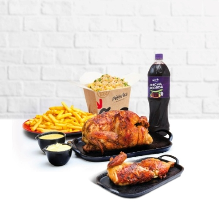 Un Poyero más 1/4, caja de papa grande 600 g, cremas (1 ají de 4 oz, 1 mayonesa de 4 oz más 2 kétchup de 8 g), ensalada grande con vinagreta de 4 oz y bebida de 1.5 L a elección.