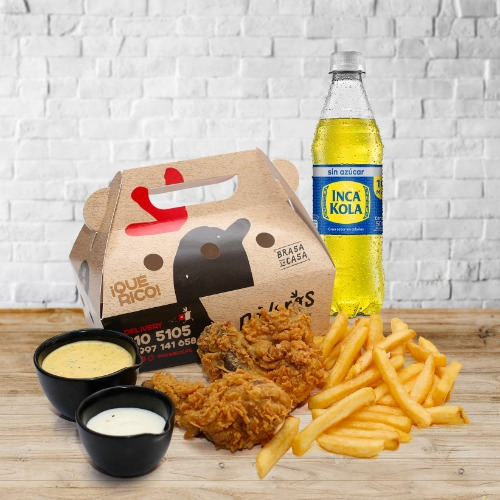2 Piezas broaster, papas fritas (150g), cremas (1 ají de 4 oz, 1 mayonesa de 4 oz más 1 kétchup 8 g) y 1 bebida mediana a elección.