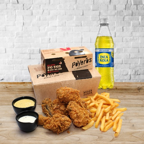 8 Piezas broaster, 1 caja de papas fritas grandes 600 g, cremas (1 ají de 4 oz, 1 mayonesa de 4 oz más 2 kétchup de 8 g) y 1 bebida a elección de 1.5 L.