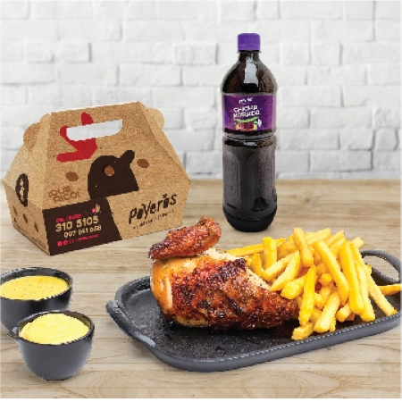 1/2 Pollo a la brasa con papas fritas y gaseosa mediana a elección.