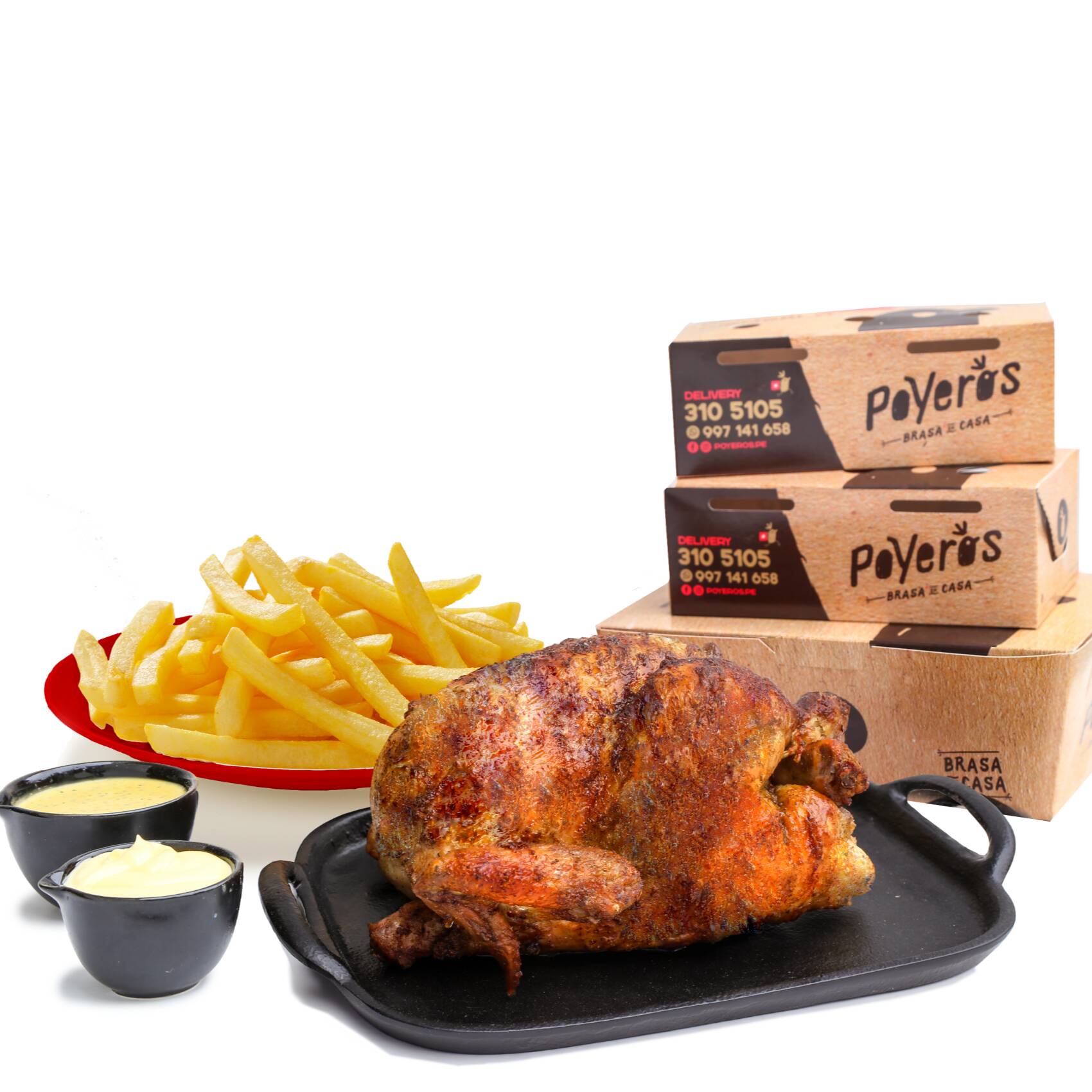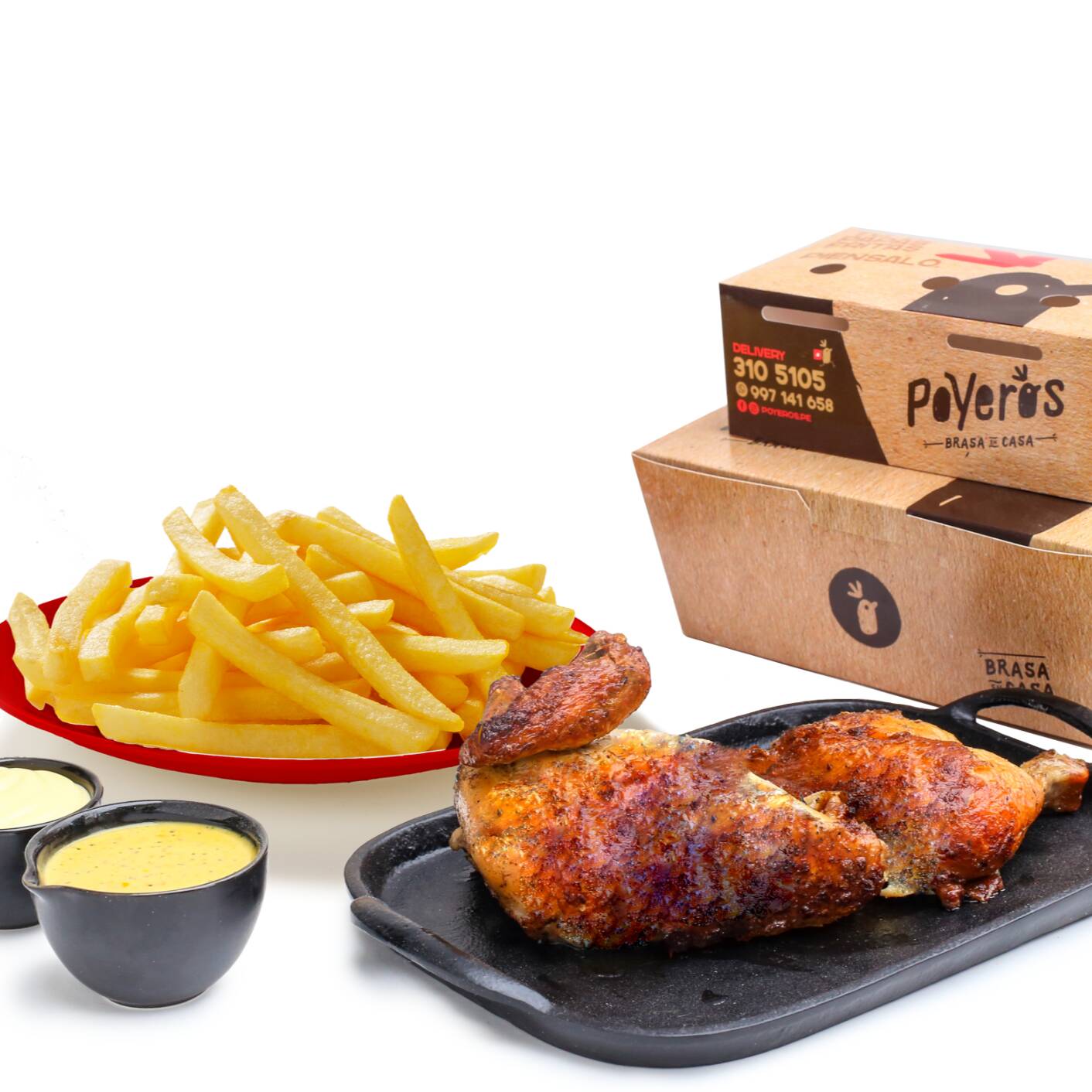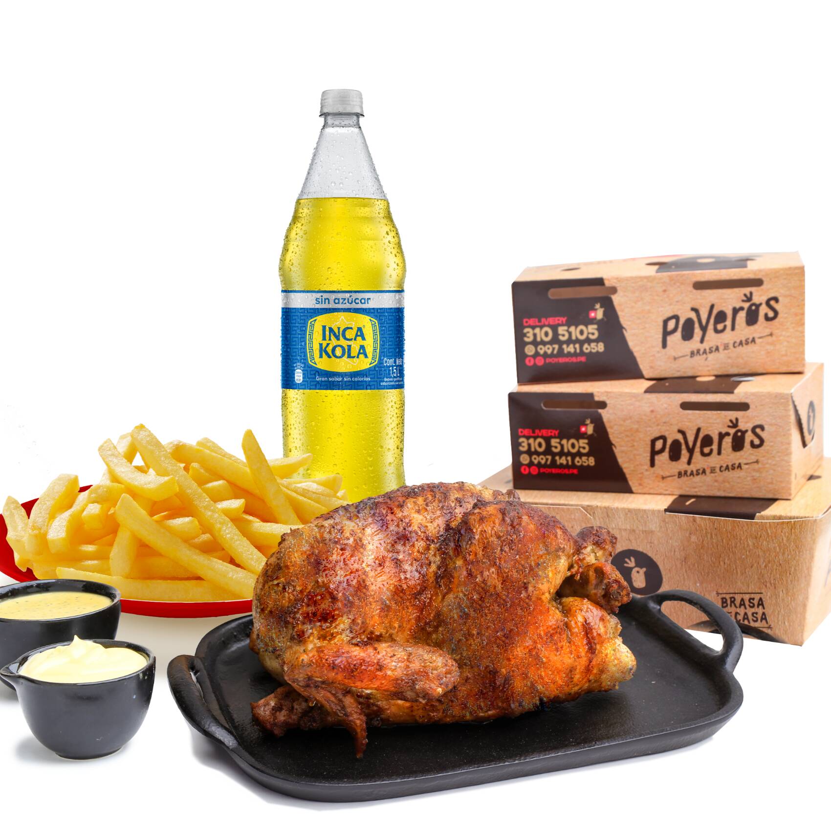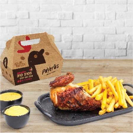 Un Poyero más 1/4, caja de papa grande 600 g, cremas (1 ají de 4 oz, 1 mayonesa de 4 oz más 2 kétchup de 8 g) con bebida de 1.5 L a elección.