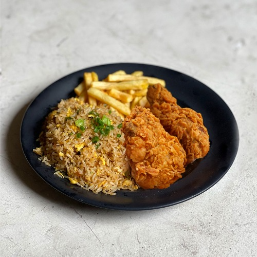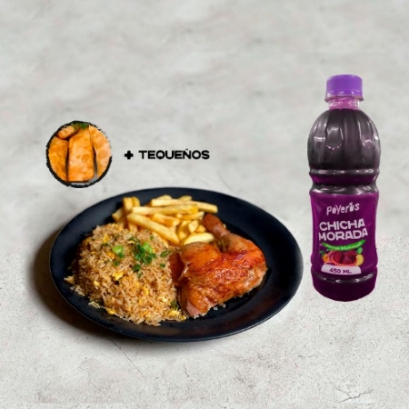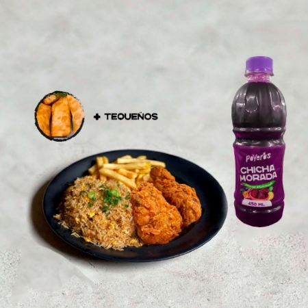 2 Piezas broaster, arroz chaufa (300g), papas fritas (100g), cremas (1 ají de 2 oz, 1 mayonesa de 2 oz más 1 kétchup de 8 g).