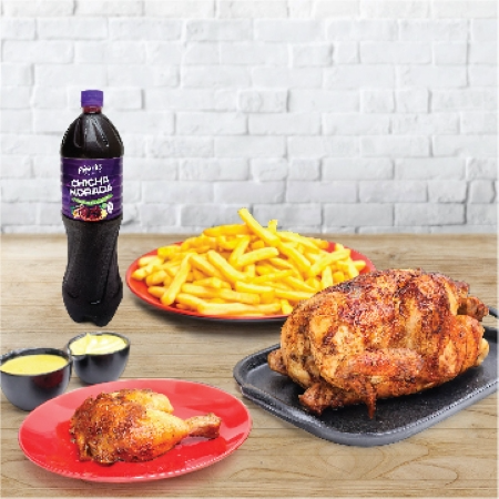 4 Piezas broaster, 1 caja de papas fritas medianas 300 g, cremas (1 ají de 4 oz, 1 mayonesa de 4 oz más 1 kétchup de 8 g) y 1 chicha morada de 1 L.
