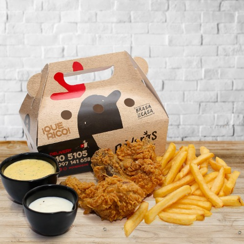 2 Piezas broaster, papas fritas (150g) , cremas (1 ají de 4 oz, 1 mayonesa de 4 oz y 1 kétchup 8 g).