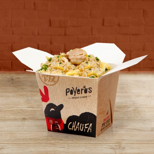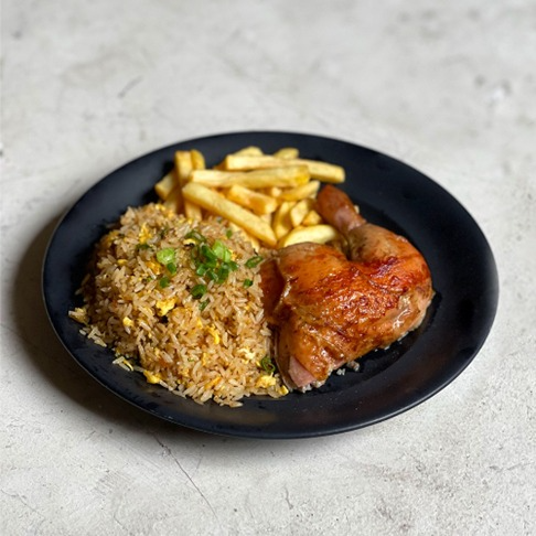 1/4 Poyero, arroz chaufa (300g), papas fritas (100g), cremas (1 ají de 2 oz, 1 mayonesa de 2 oz y 1 kétchup de 8 g).