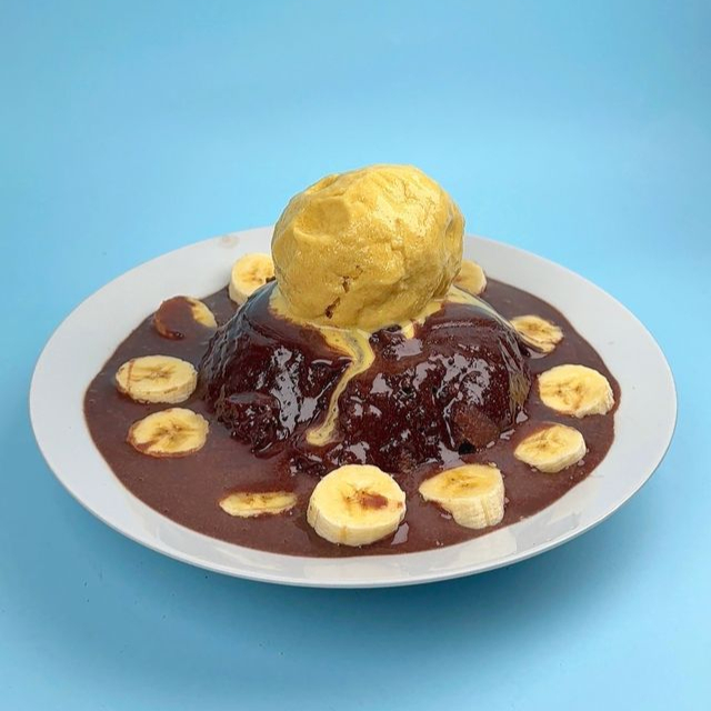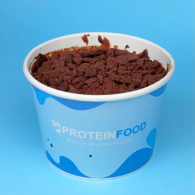 Brownie chocolatoso a base de harina de avena, cacao en polvo, chocolate organico al 85%, castañas, stevia, panela, huevo y proteina aislada. Acompañado de un helado de proteína artesanal, sin azúcar añadido, hecho a base de leche deslactosada y proteína.