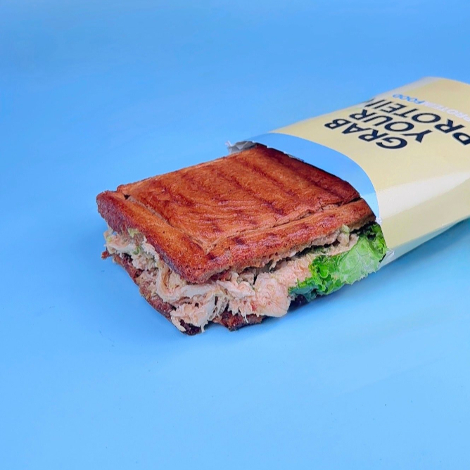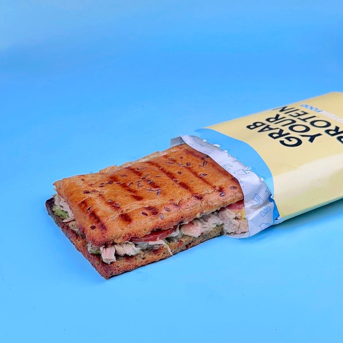 Atún mezclado con nuestra cremosa lactonesa, salsa pesto casera, palta fresca y tomate, servido en pan de avena proteico tostado y crocante.