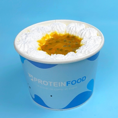 Helado hecho a base de proteina aislada de suero de leche, maracuya, mango, leche descremada ligth, chantilly de coco, queque de almendra, y stevia.