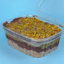 Delicioso cuchareable proteico de alfajor sin gluten, con capas de alfajor de olla sin azucar y crema proteica de pistachos endulzada con eritritol. decorado con pistachos tostados.