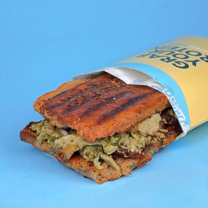 Pollo mezclado con nuestra salsa pesto, tomate cherry caramelizado y queso mozarella ligth, servido en pan proteico.