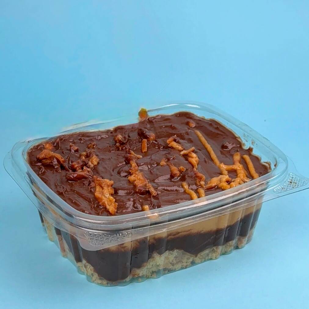 Mousse proteico a base de proteína aislada, cacao, leche descremada light endulzado con eritritol con capas de manjar proteico de mantequilla de maní.