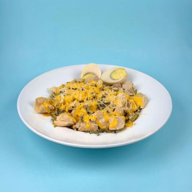 120 gr de pollo en cubos, pasta integral, huevo duro, salsa huancaína y queso parmesano light.