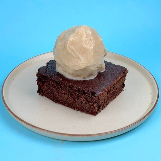 Helado proteico sabor chocolate, brownie proteico de cacao y harina de avena, chantilly de coco y pecanas caramelizadas con eritritol.