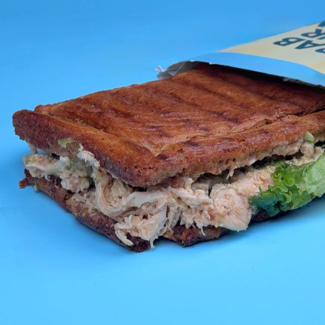 Atún mezclado con nuestra cremosa lactonesa, salsa pesto casera, palta fresca y tomate, servido en pan de avena proteico tostado y crocante.