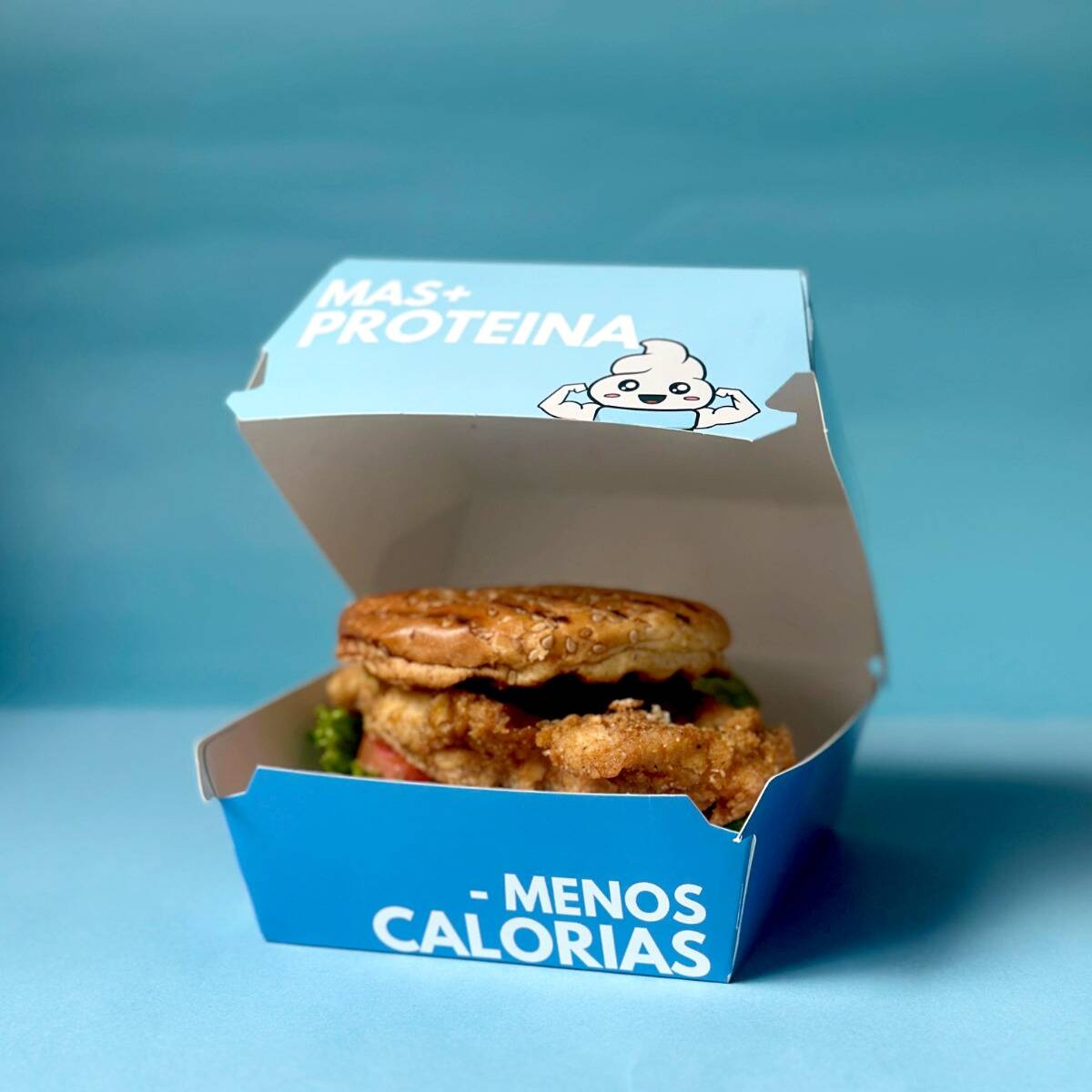 Pan multisemillas, 120 gramos de filete de pollo empanizado, lechuga, tomate en rodajas y cebolla caramelizada.
