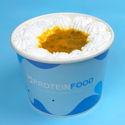 Base de galleta de harina de arroz, mousse de maracuya (proteína aislada, leche, stevia) decorado con chantilly de coco y maracuyá.