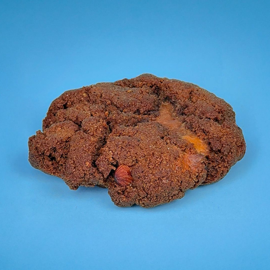 Galleta elaborada con harina de almendra, proteína de suero de leche, cacao, ghee, almendras, huevo y eritritol. rellena de manjar proteico sin azucar