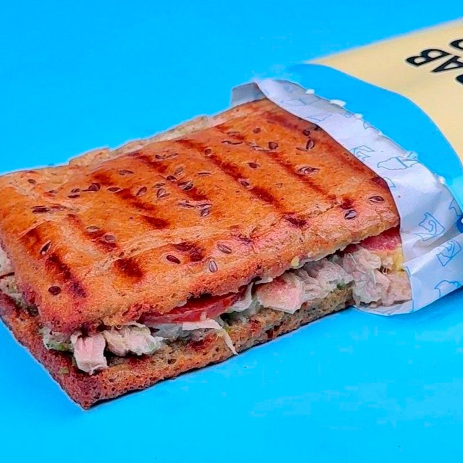 Atún mezclado con nuestra cremosa lactonesa, salsa pesto casera, palta fresca y tomate, servido en pan de avena proteico tostado y crocante.