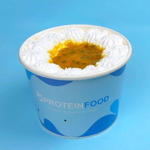 Helado hecho a base de proteina aislada de suero de leche, maracuya, mango, leche descremada ligth, chantilly de coco, queque de almendra, y stevia.